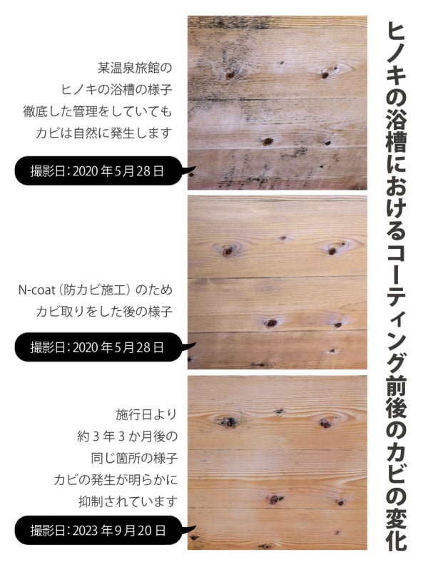 金剛檜椅子に施している「エヌコート」をヒノキの浴槽面に施したお写真も御覧ください。